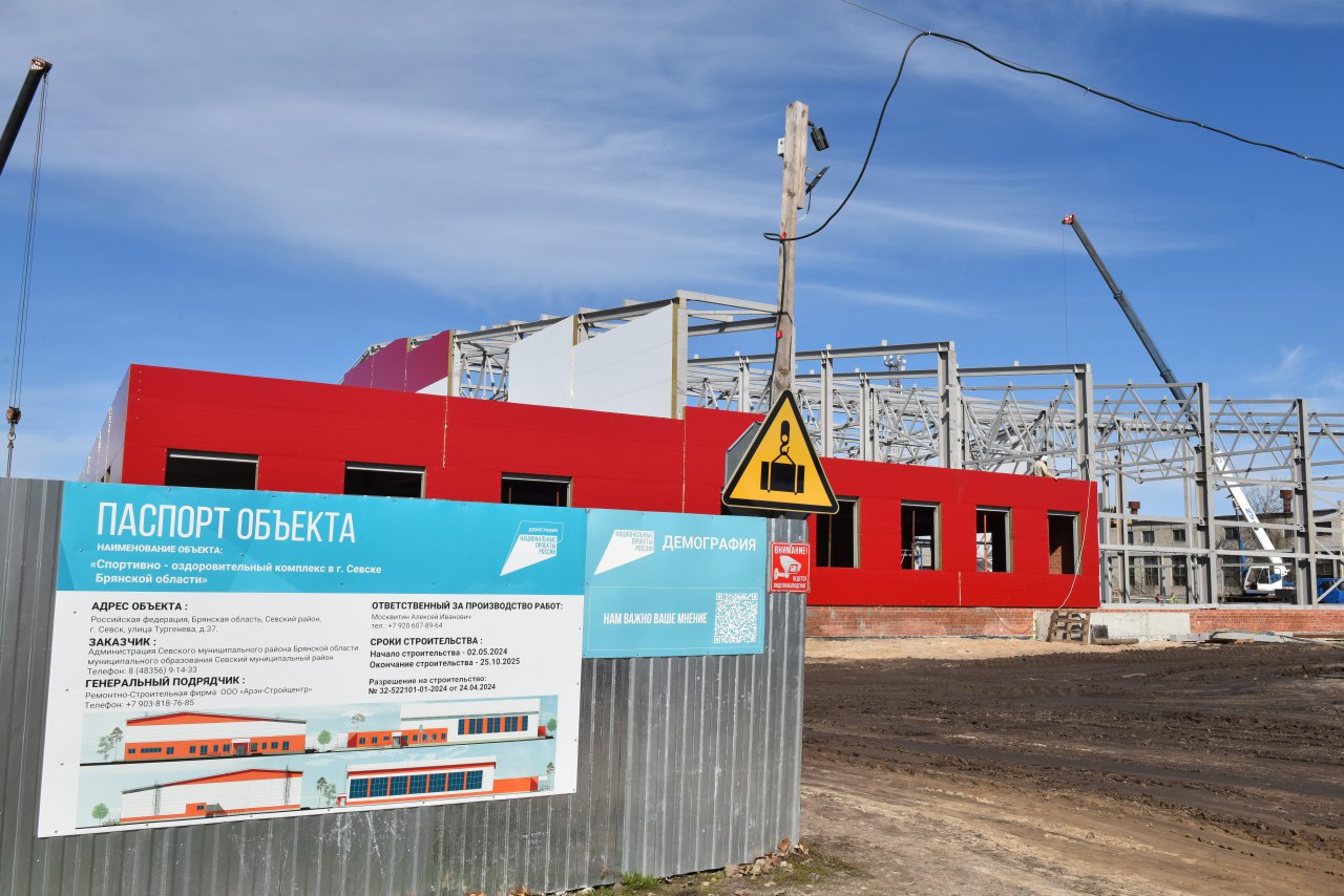 В настоящее время строительство ФОКа с бассейном осуществляется в Севске. Работы ведутся в соответствии с графиком. До конца месяца планируется завершить монтаж сэндвич-панелей, а к середине мая должен быть закрыт контур, залито дно чаши бассейна, после чего строители приступят к оштукатуриванию стен.