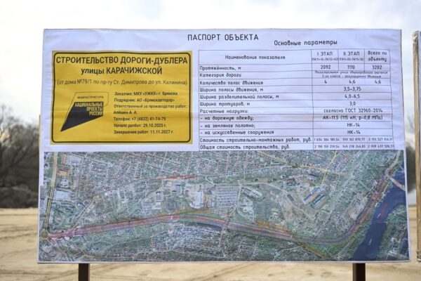 При поддержке правительства России и Минстроя в Брянске реализуется масштабный проект по строительству дороги-дублёра улицы Карачижской. Новая магистраль протяжённостью 3,2 км разгрузит центр города и обеспечит прямой выезд из Телецентра в Фокинский район. Всего на объект направят 2,9 млрд рублей, из которых 2,8 млрд поступят из федерального бюджета.